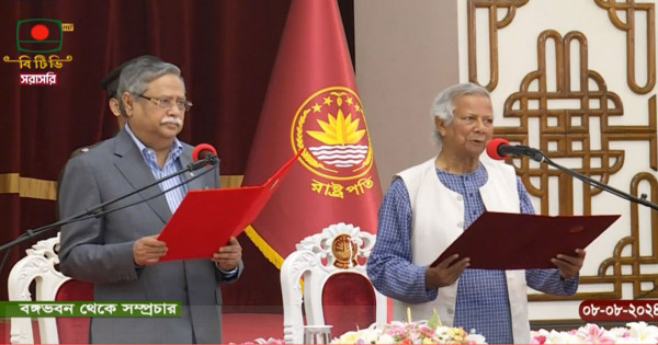 শান্তিতে নোবেল জয়ী প্রফেসর ড. মুহাম্মদ ইউনূসের নেতৃত্বে অন্তর্বর্তীকালীন সরকারের ১৪ সদস্যের উপদেষ্টা পরিষদ শপথ গ্রহণ করেছে। বৃহস্পতিবার রাত নয়টায় বঙ্গভবনের দরবার হলে আয়োজিত শপথ অনুষ্ঠানে প্রথমে প্রধান উপদেষ্টা প্রফেসর ড. মুহাম্মদ ইউনূসকে প্রথম শপথ বাক্য পাঠ করান প্রেসিডেন্ট মো. সাহাবুদ্দিন।