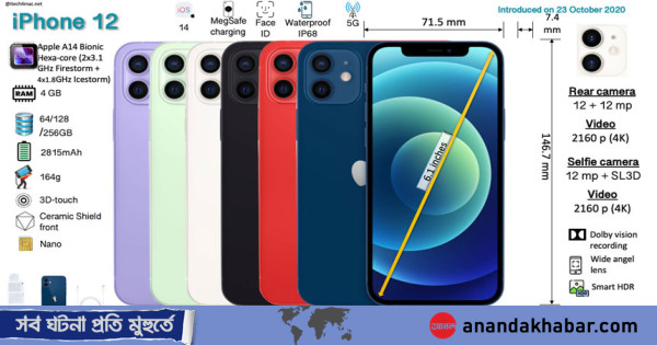 iPhone 12 হলো অ্যাপলের একটি জনপ্রিয় স্মার্টফোন। এটি অনেক উন্নত ফিচার নিয়ে এসেছে। চলুন দেখি এর বিস্তারিত স্পেসিফিকেশন এবং বাংলাদেশে এর মূল্য।